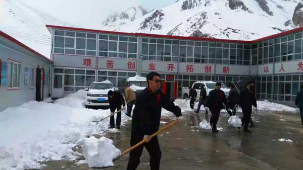 2016年3月21日青海共和縣青海銅鑫礦業(yè)有限公司礦區(qū)迎來了自春節(jié)以來的第一場大雪,前幾這里還太陽高照,天氣晴朗,與此同時洛陽陽光明媚,鳥語花香,現(xiàn)在青海銅鑫礦區(qū)則被厚厚的白雪覆蓋,呈現(xiàn)出另一番別樣的景像。青海分公司員工也一起參加礦山工作區(qū)的除雪工作,個個干得熱火朝天,一會兒大院里的雪就被清理完畢。
