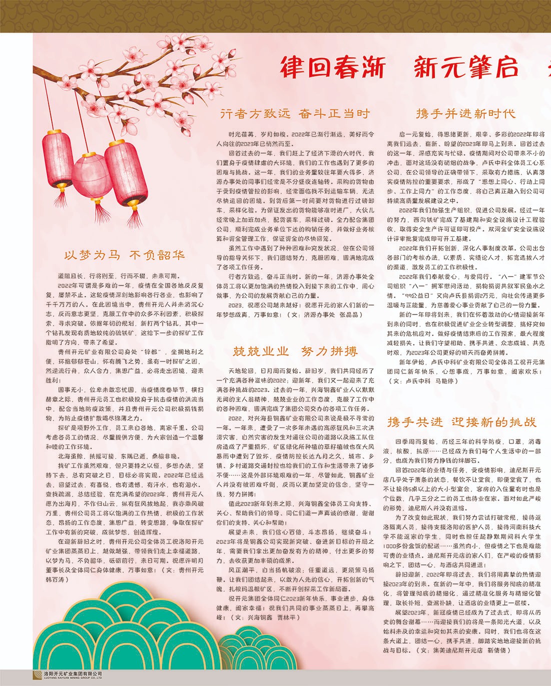 洛陽開元礦業(yè)集團(tuán)有限公司簡介洛陽開元礦業(yè)集團(tuán)有限公司,始成立于2006年,位于洛陽市開元大道269號。集團(tuán)旗下共有五余家全資子公司,業(yè)務(wù)涉及有色金屬礦山開發(fā)、礦產(chǎn)品購銷與進(jìn)出口貿(mào)易、房地產(chǎn)開發(fā)、文化藝術(shù)、企業(yè)管理與咨詢、資本投資等多個領(lǐng)域。民建河南省委委員、民建河南省委企業(yè)委副主任、民建洛陽市委委員、企業(yè)委主任、洛陽民建企業(yè)家協(xié)會會長許明月是公司創(chuàng)始人,現(xiàn)任洛陽開元礦業(yè)集團(tuán)有限公司董事長。在礦業(yè)領(lǐng)域,洛陽開元礦業(yè)集團(tuán)擁有多家實(shí)力雄厚的子公司:貴州開元礦業(yè)有限公司探、采礦權(quán)面積共11.33平方公里;興??h銅鑫礦業(yè)有限公司探礦權(quán)面積8.76平方公里,礦山資源潛力巨大;2021年,開元集團(tuán)與盧氏中科礦業(yè)有限公司開展戰(zhàn)略合作。盧氏中科礦業(yè)有限公司專注于有色金屬的浮選、加工和銷售,擁有強(qiáng)大的技術(shù)支撐平臺,是集探、采、選、冶、研為一體的中大型綜合礦業(yè)企業(yè)。目前,盧氏中科王家河1000噸選礦廠已成功投產(chǎn),雙河金礦、柳關(guān)欒盧鉛鋅礦相繼順利開工,樓房銀礦與圪老灣鉛鋅礦的深部探礦重大突破,標(biāo)志著礦山版圖取得重大進(jìn)展,為開元集團(tuán)后續(xù)發(fā)展奠定了堅(jiān)實(shí)基礎(chǔ)。在文化傳媒領(lǐng)域,洛陽市明月美術(shù)館通過豐富多樣的藝術(shù)展覽、學(xué)術(shù)研討和公共教育活動,努力打造一個集展覽、交流、教育、研究為一體的綜合性藝術(shù)平臺。此外,在金融投資領(lǐng)域,開元集團(tuán)旗下的北京明峰資本管理有限公司專注于投資具有高增長潛力的優(yōu)秀企業(yè),特別是高科技、新能源、環(huán)保等新興產(chǎn)業(yè),為客戶提供個性化的資產(chǎn)配置服務(wù)。在做好企業(yè)經(jīng)營的同時,開元集團(tuán)始終不忘企業(yè)的社會責(zé)任和家國情懷,以突出的愛心公益事跡,開展了一系列公益慈善活動:“民建林”公益事業(yè)通過“思源基金”“幫幫公益”線上公益平臺,與眾多愛心人士籌措資金20余萬元;資助541名貧困大學(xué)生共計(jì)270余萬元,推進(jìn)“數(shù)字助力——河南AI人才培養(yǎng)”;捐款10萬元,馳援京津冀、黑龍江洪水地質(zhì)災(zāi)害……公司于2017年底被洛陽市慈善總會評為“洛陽慈善風(fēng)云榜——十大愛心集體”。洛陽開元礦業(yè)集團(tuán)有限公司秉承持續(xù)發(fā)展理念,憑借多年來良好的企業(yè)信譽(yù)與經(jīng)營業(yè)績,與全國多家企業(yè)建立了良好合作關(guān)系,受到社會各界的一致好評,多次榮獲“納稅標(biāo)兵”“先進(jìn)企業(yè)”“招商引資模范企業(yè)”等榮譽(yù)稱號?;赝麃頃r路,開元人勠力同心,以“闖”的精神和“創(chuàng)”的勁頭,一路披荊斬棘,踏過千山萬水;展望新未來,開元人凝心聚力,不執(zhí)于“舊”,無畏于“新”,秉承“勇于跨越,追求卓越”的企業(yè)精神,乘著國家高質(zhì)量發(fā)展新征程的東風(fēng),跨過高山,越過大海,向著集團(tuán)多元化、國際化的目標(biāo),逐夢遠(yuǎn)航,跨越前行!